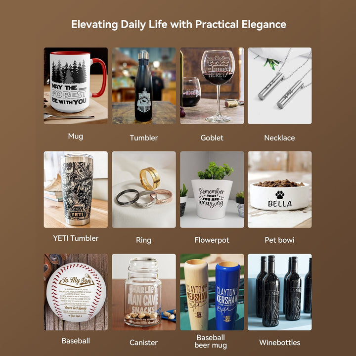 - Verbesserte Vielseitigkeit: Perfekt zum Gravieren von standardmäßigen und leicht unregelmäßigen zylindrischen Objekten, darunter Thermoskannen, Baseballschläger und Weingläser.