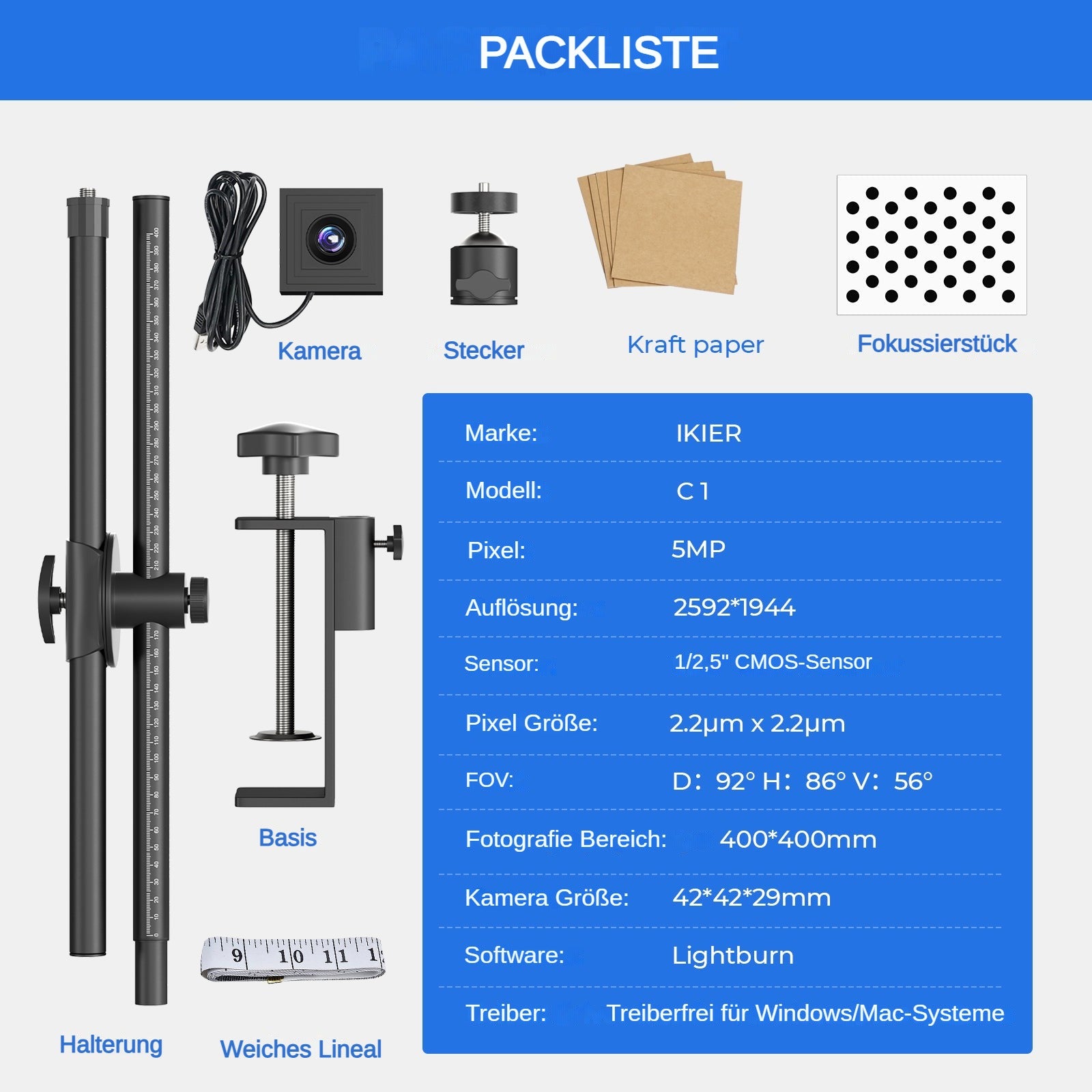 1. Industrielle Digitalkamera: Anders als die elektronische Kamera ist die iKier C1-Kamera eine industrielle 5-Megapixel-HD-Digitalkamera, die eine genaue Positionierung während des Gebrauchs gewährleistet;