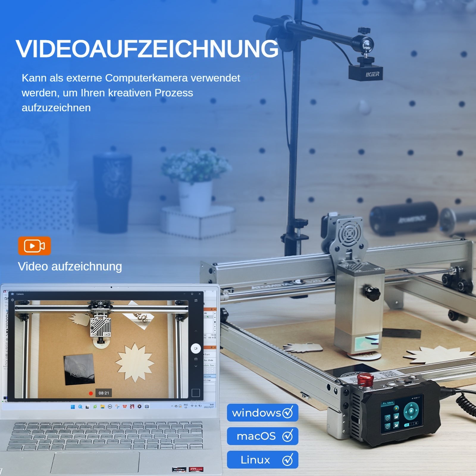 7. Hohe Anpassungsfähigkeit: Die iKier-Kamera kann an alle iKier-, Atomstack-, Ortur-, NEJE- und xTool-Rahmen-Lasergravurmaschinen angepasst werden (Lightburn-Software ist erforderlich).
