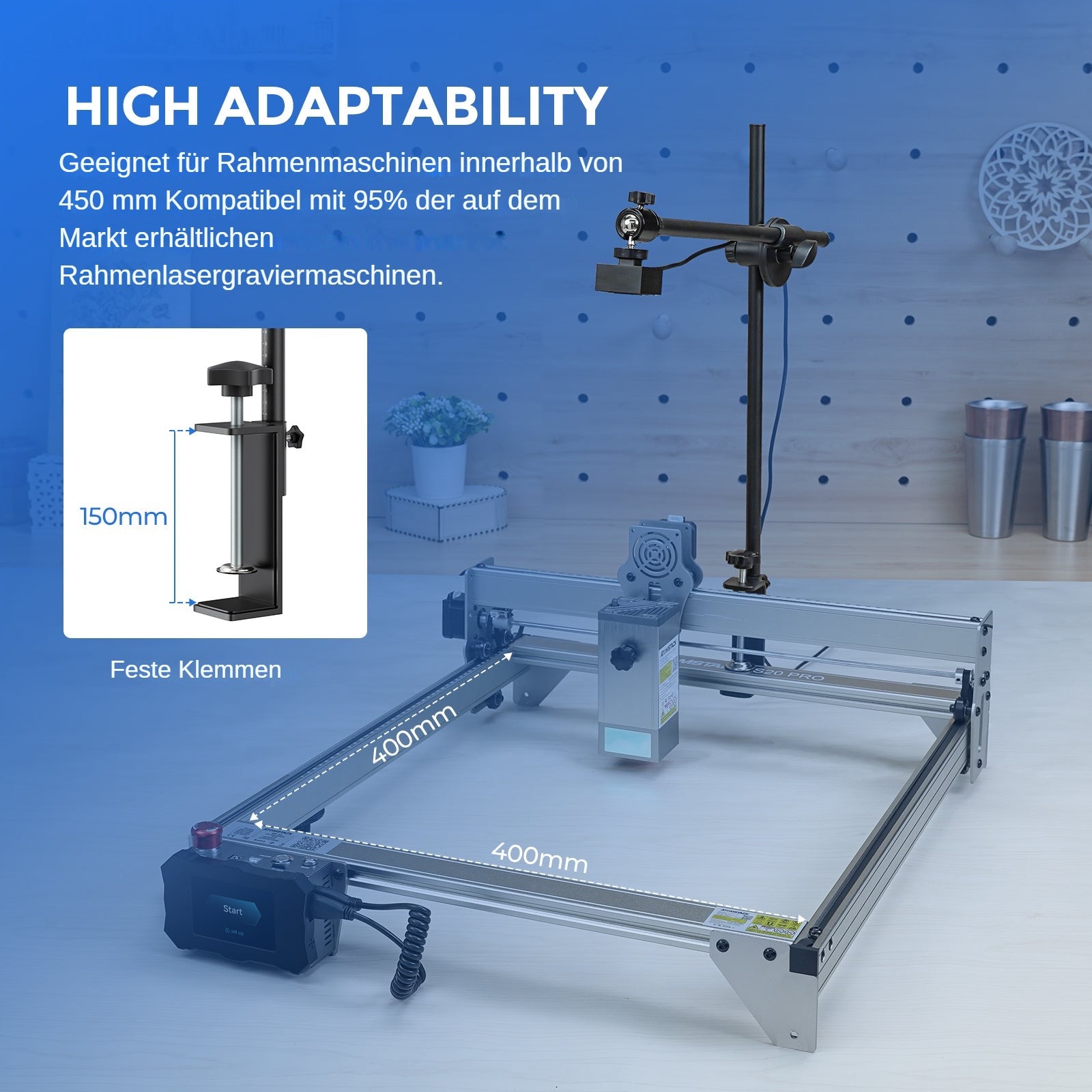 2. Großer Positionierungsbereich: Industrielles Weitwinkelobjektiv, perfekt für Maschinen mit einem Rahmen von 450 x 450 mm (Fotografiebereich 400 x 400 mm);