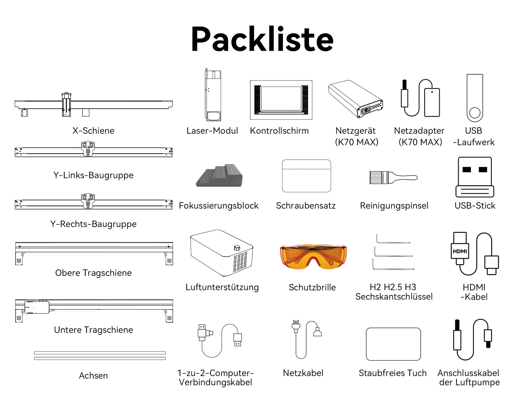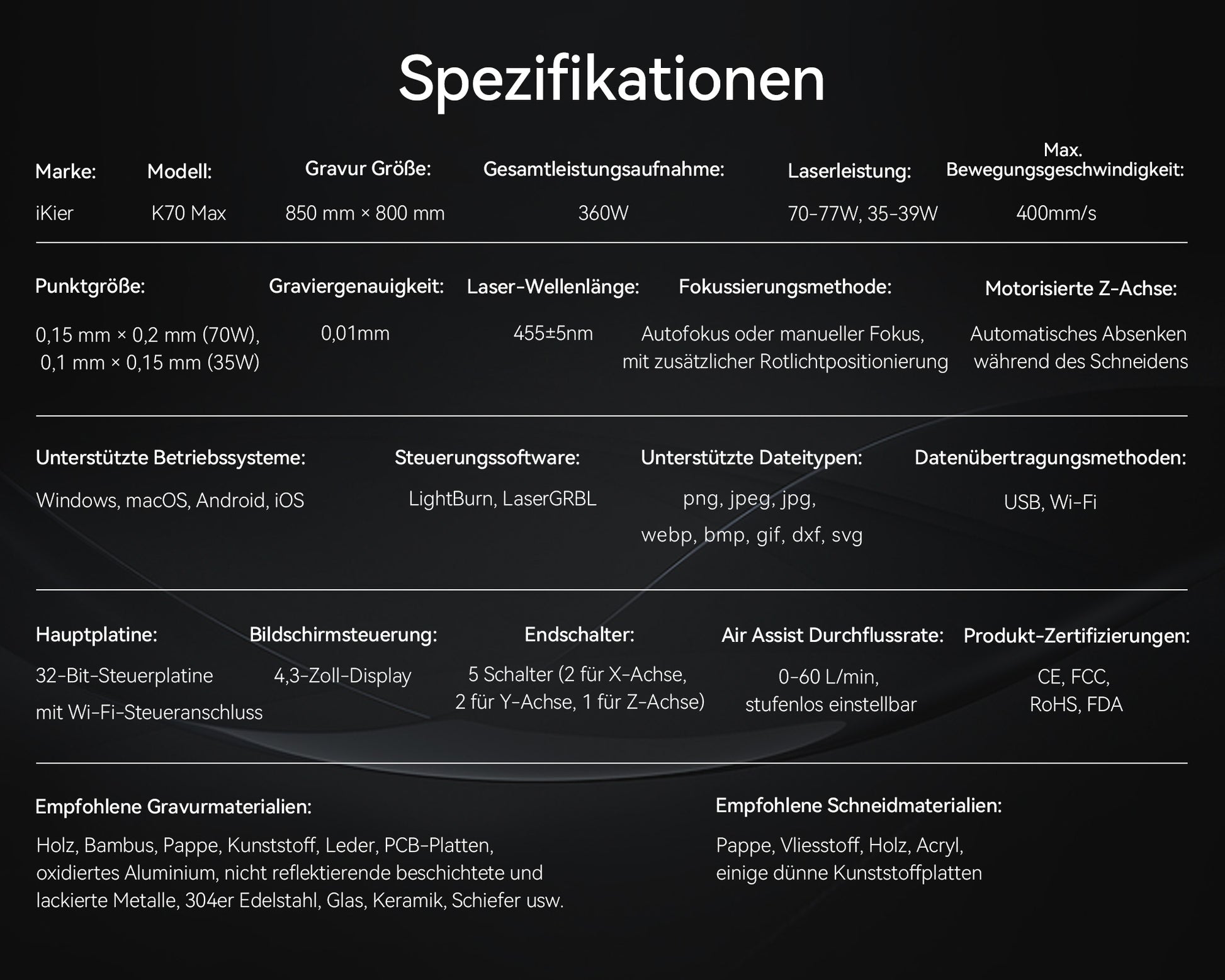 | Laserleistung | 70–77W (Schneiden)/35–39W (Gravieren) |