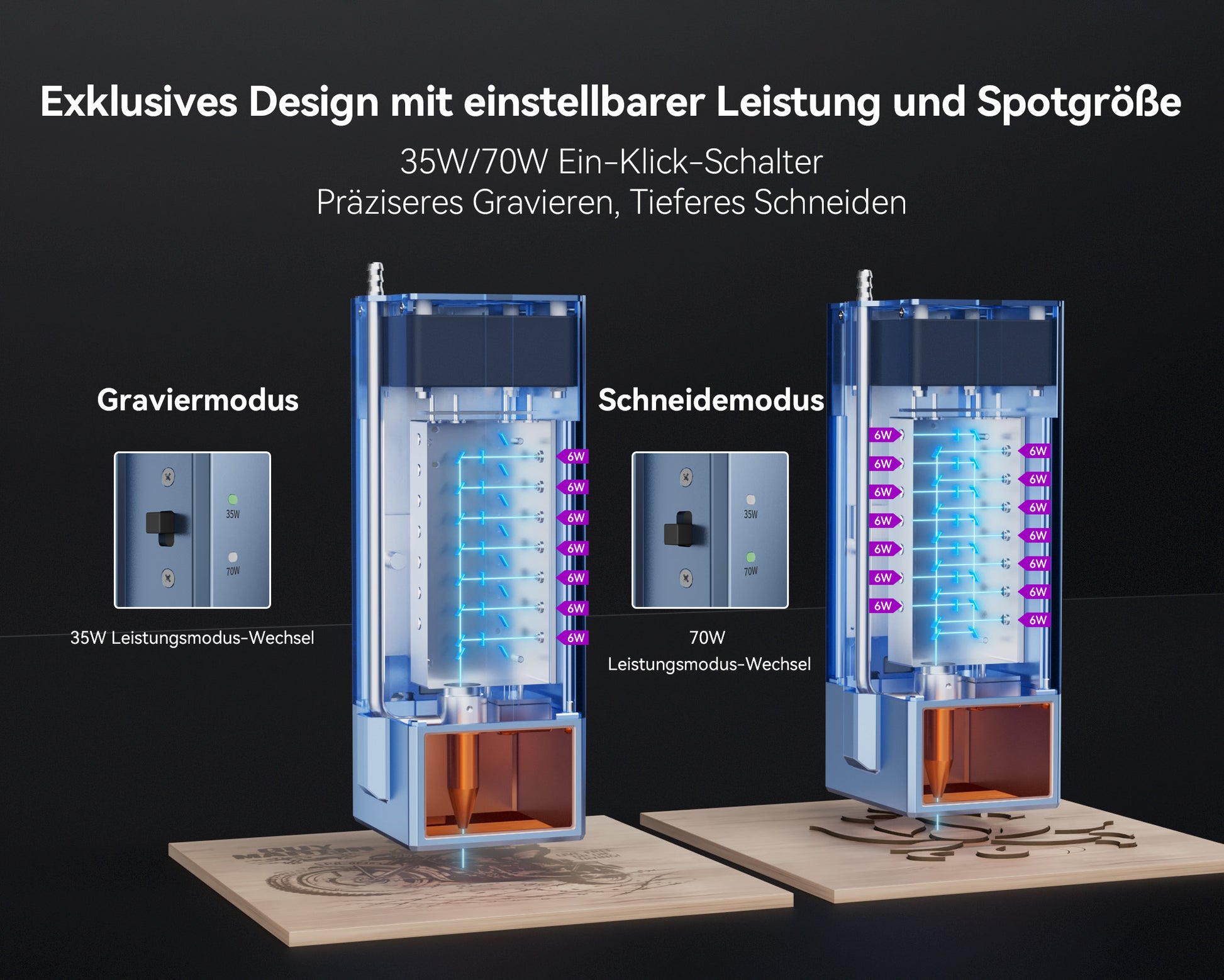 | Laserleistung | 70W zum Schneiden & 35W zum Gravieren (Ein-Klick-Wechsel) | 70W Fest |