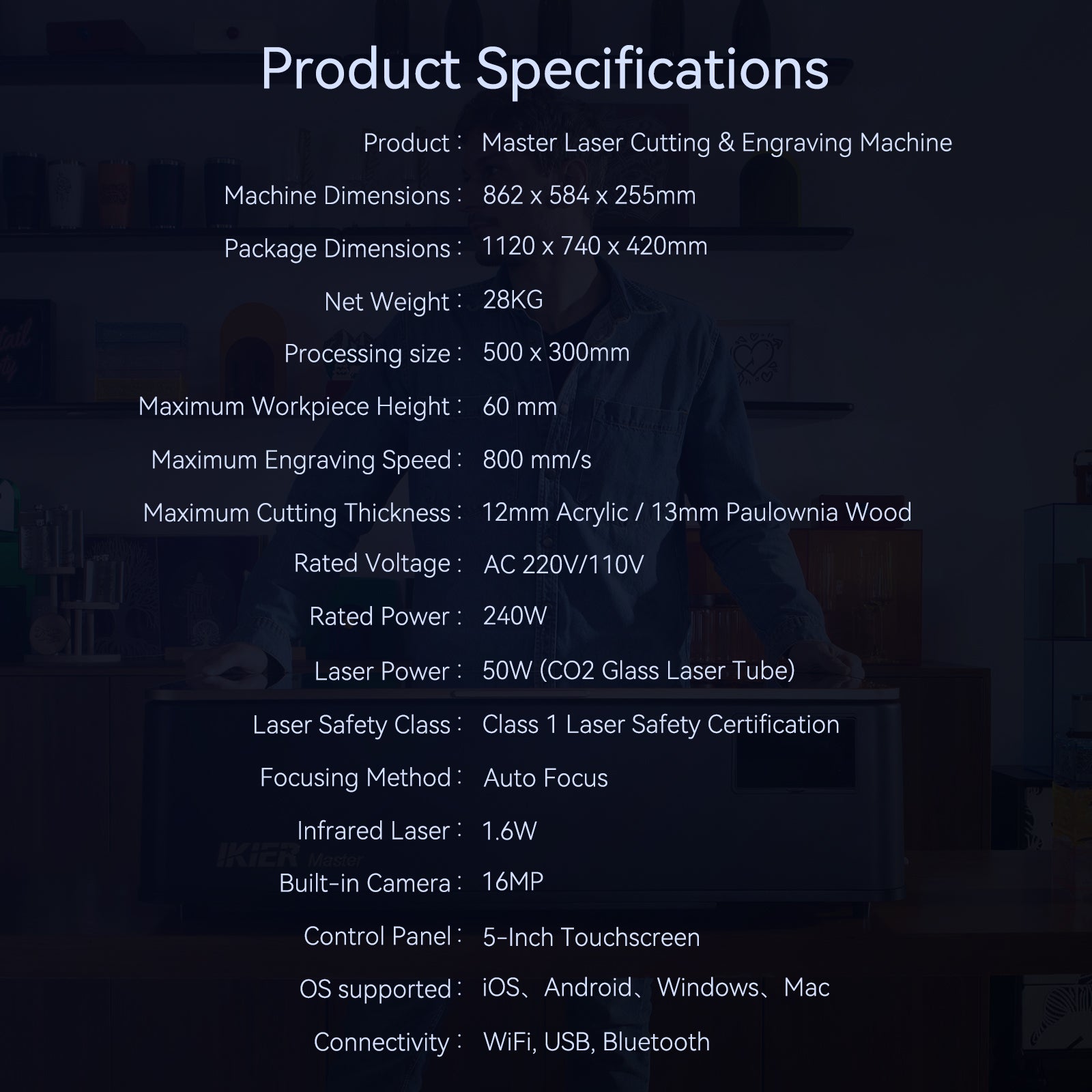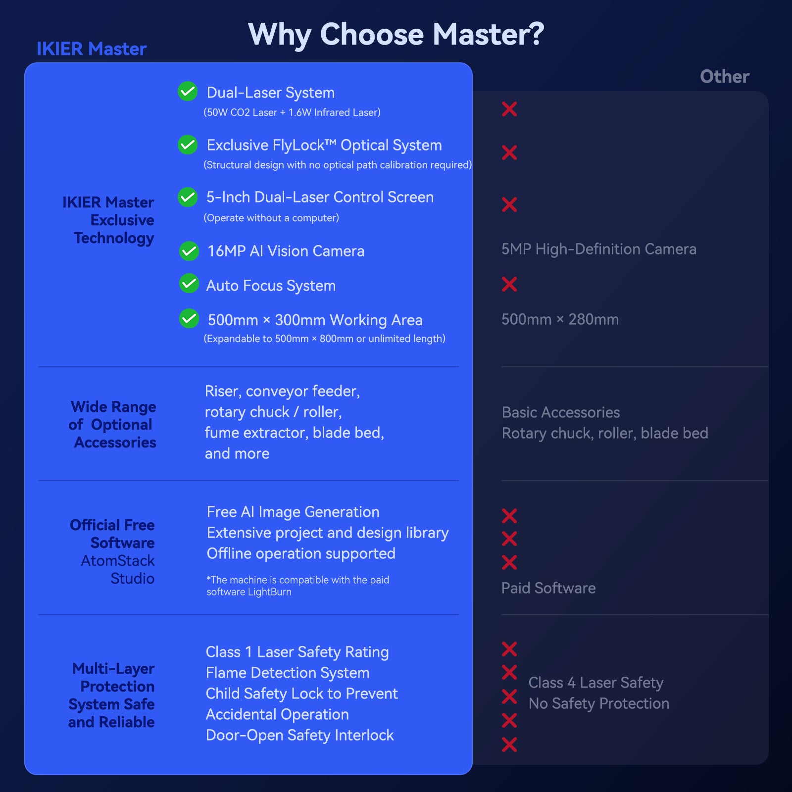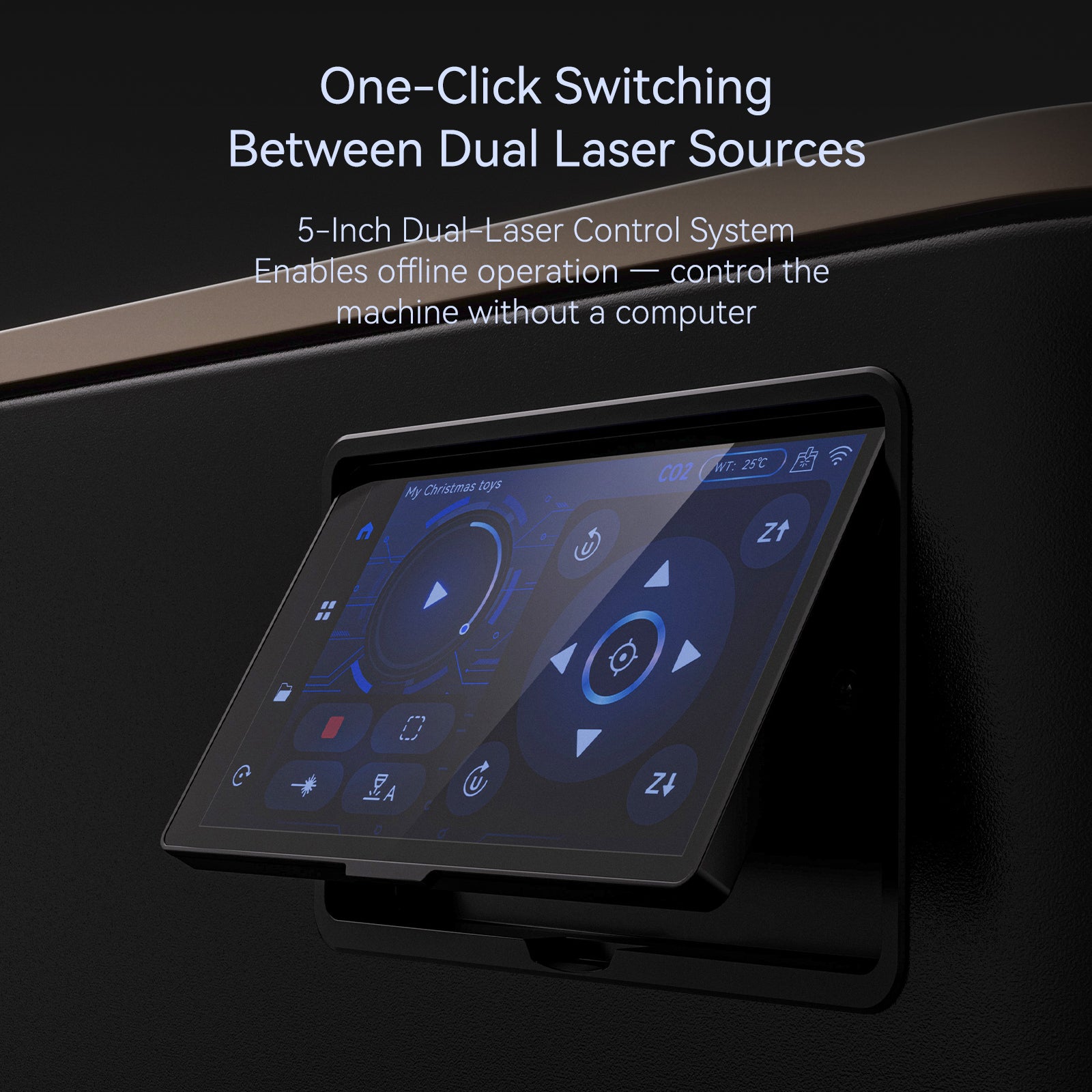 - Doppelte Laserleistung, maximale Vielseitigkeit: Ausgestattet mit einem 50-W-CO₂-Laser für leistungsstarkes Schneiden und einem 1,6-W-IR-Laser Laser für präzise Metallgravur.